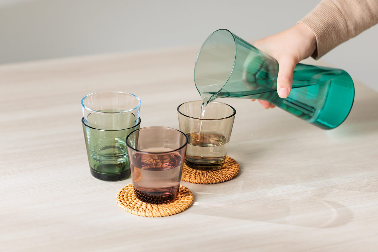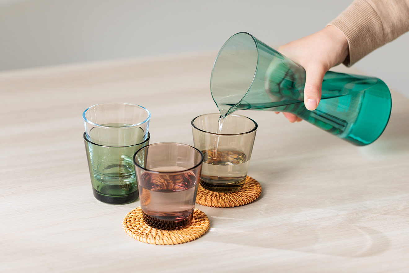 タンブラーのカラーはクリア、リネン、パイングリーン、カルーナ。調和が美しく、日常に溶け込む4色です。