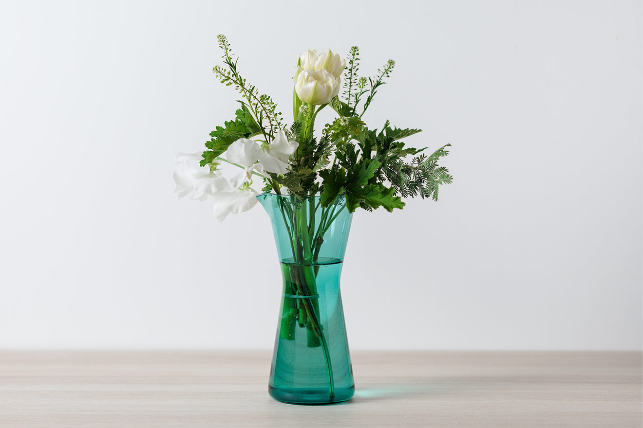 中央がくびれたデザインは、持ちやすさとフォルムの美しさを兼ね備え、カイ・フランクのデザインの特徴がよく表れています。ドリンクを提供するだけでなく、フラワーベースとしてのご使用もおすすめです。
