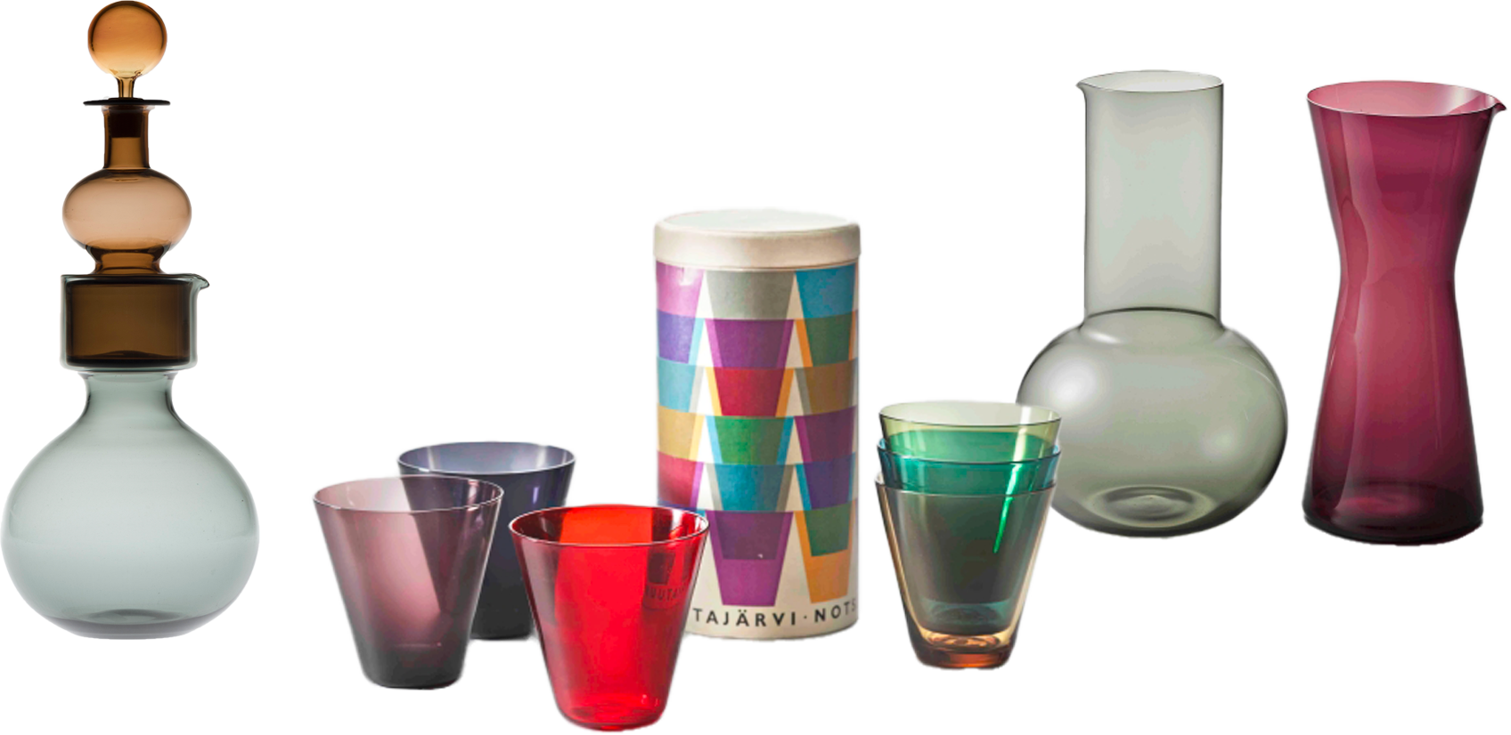 作品切り抜き:カイ・フランク《1610》カラフェ 1954年、《キマラ(カクテル)/2744》タンブラー 1953年 ヌータヤルヴィ・ガラス製作所 撮影:鈴木陽介