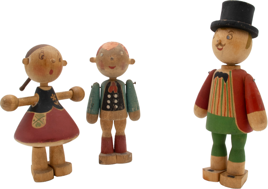 カイ・フランク 《テュット(女の子)》(左)、《ポイカ(男の子)》(中央)、《シルクスティレヒトーリ(サーカス座長)》(右) 木製人形 1945年 ©Architecture & Design Museum Helsinki